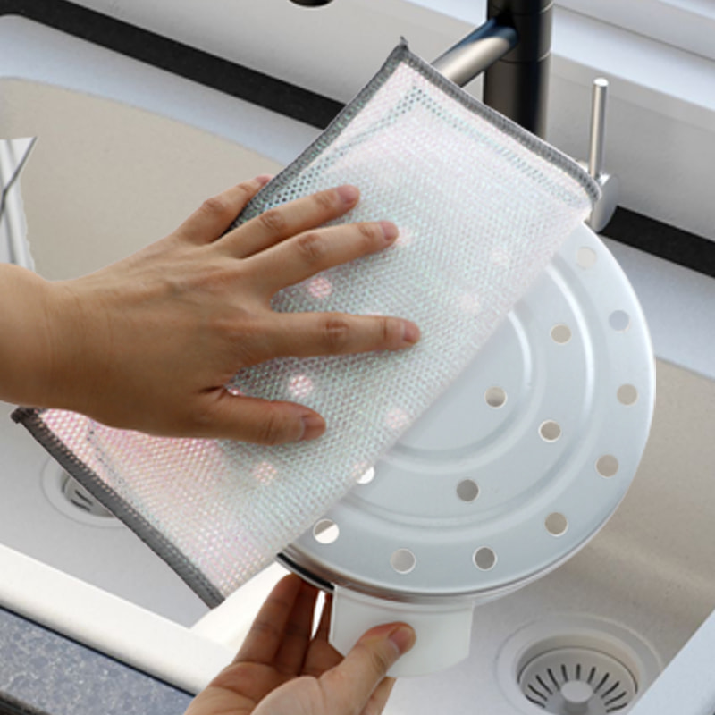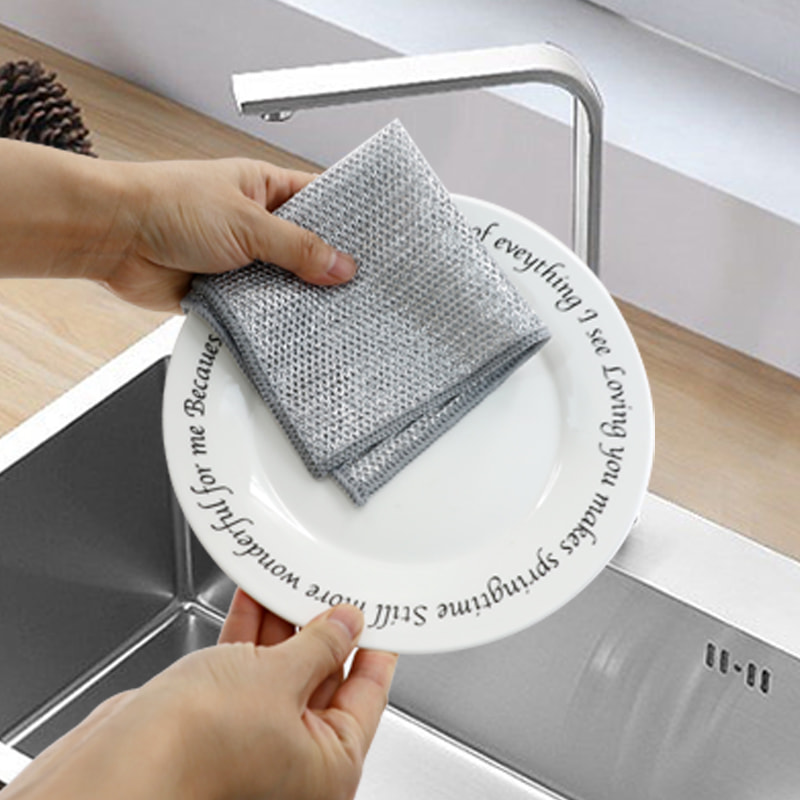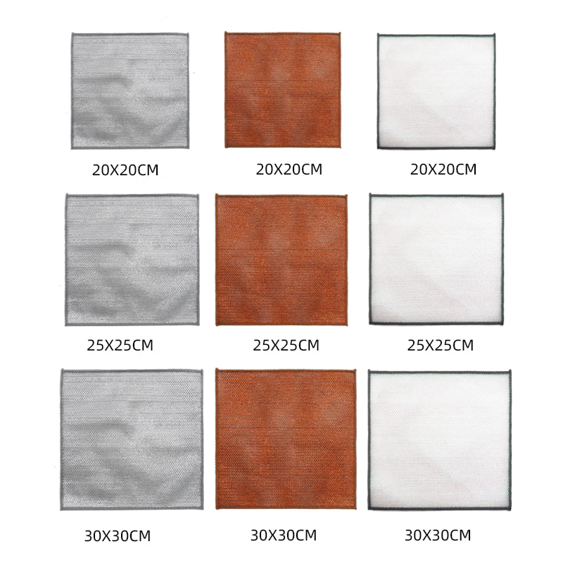 Paño de cocina de alambre de plata de doble cara, hecho de seda bronce, es muy caro; Sin recubrimiento, sin polvo, sin decoloración; Sin aceite, sin aceite, raspado fuerte pero sin daños en los utensilios de cocina. Hecho de seda colorida, es aceitoso y no pegajoso, con un alto valor de apariencia; Sin recubrimiento, sin gotas de polvo, sin decoloración del color; Raspado fuerte pero sin daños a los utensilios de cocina.